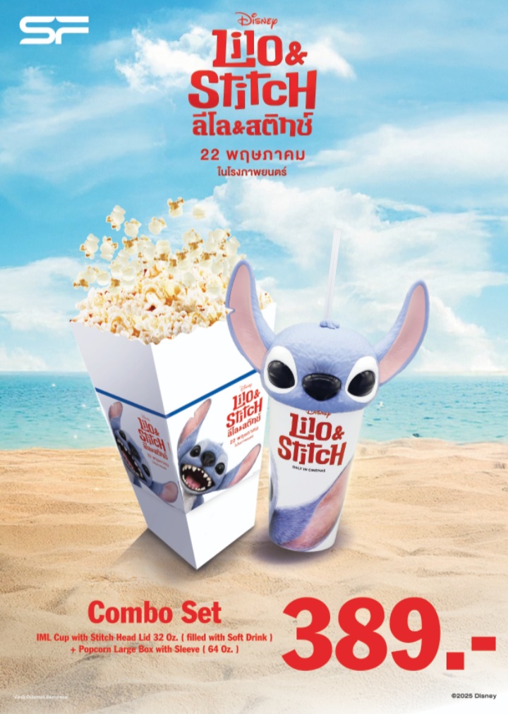 โรงภาพยนตร์ในเครือ เอส เอฟ ชวนทุกคนออกเดินทางสู่โลกแห่งมิตรภาพและความป่วน กับภาพยนตร์ไลฟ์แอ็กชั่นที่แฟนดิสนีย์ทั่วโลกรอคอย “Disney’s Lilo & Stitch ลีโลแอนด์สติทช์” พบกับเรื่องราวสุดประทับใจของเด็กสาวชาวฮาวายผู้โดดเดี่ยว และมนุษย์ต่างดาวจอมแสบ ที่จะมาสร้างความสนุกและความอบอุ่นหัวใจให้กับทุกคน พิเศษ! ที่ เอส เอฟ เท่านั้น ห้ามพลาดกับ “Lilo & Stitch Combo Set (ลีโลแอนด์สติทช์คอมโบเซท)” คอมโบเซทสุดเอ็กซ์คลูซีฟลิขสิทธิ์แท้จากภาพยนตร์ ในราคาเพียง 389 บาท ภายในเซทประกอบด้วย IML Cup with Stitch Head แก้วน้ำพร้อมฝาปิดคาแรกเตอร์ Stitch พร้อมน้ำอัดลมขนาด 32 ออนซ์ 1 แก้ว และ ถังป๊อปคอร์นพร้อม Sleeve ลายภาพยนตร์ ขนาด 64 ออนซ์ (สามารถเลือกรสชาติป๊อปคอร์นได้) วางจำหน่ายตั้งแต่วันที่ 17 พฤษภาคม 2568 เป็นต้นไปจนกว่าสินค้าจะหมด ที่โรงภาพยนตร์ในเครือ เอส เอฟ สาขาที่ร่วมรายการ