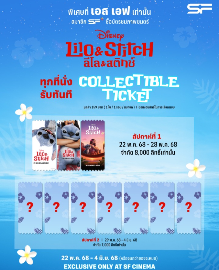 - สมาชิก SF+ ที่ซื้อบัตรชมภาพยนตร์ “Disney’s Lilo & Stitch ลีโลแอนด์สติทช์”ทุกที่นั่งรับทันที SF Collectible Ticket ลิขสิทธิ์แท้จากภาพยนตร์ ( 1 ใบ / 1 รอบ / 1 สมาชิก ) มี 6 แบบให้สะสม ตั้งแต่วันที่ 22 พฤษภาคม 2568 – 4 มิถุนายน 2568 หรือจนกว่าสินค้าจะหมด·