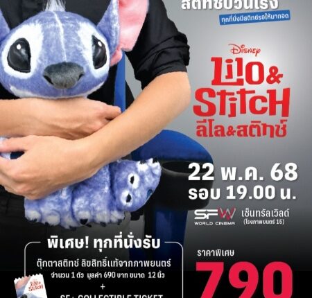 - รอบพิเศษ !! SF Hug Friends Screening ภาพยนตร์ “Disney’s Lilo & Stitch ลีโลแอนด์สติทช์” ซื้อบัตรชมภาพยนตร์วันที่ 22 พฤษภาคม 2568 รอบเวลา 19.00 น. (โรงภาพยนตร์ที่ 15) โรงภาพยนตร์ เอส เอฟ เวิลด์ ซีเนม่า ศูนย์การค้าเซ็นทรัลเวิลด์ ในราคา 790 บาท ทุกที่นั่งรับ ตุ๊กตา Stitch 1 ตัว ขนาด 12 นิ้ว และ SF+ Collectible Ticket 1 ใบ