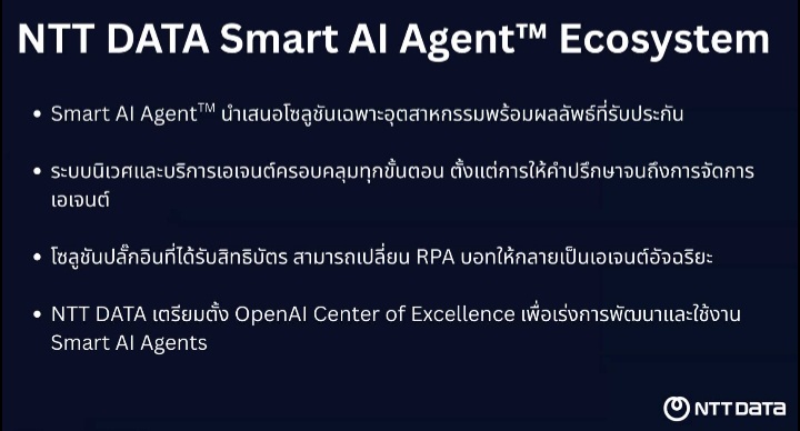 NTT DATA เปิดตัวระบบนิเวศ Smart AI AgentTM ปฏิวัติโซลูชันอุตสาหกรรมด้วยระบบอัตโนมัติอัจฉริยะและพันธมิตรเชิงกลยุทธ์
