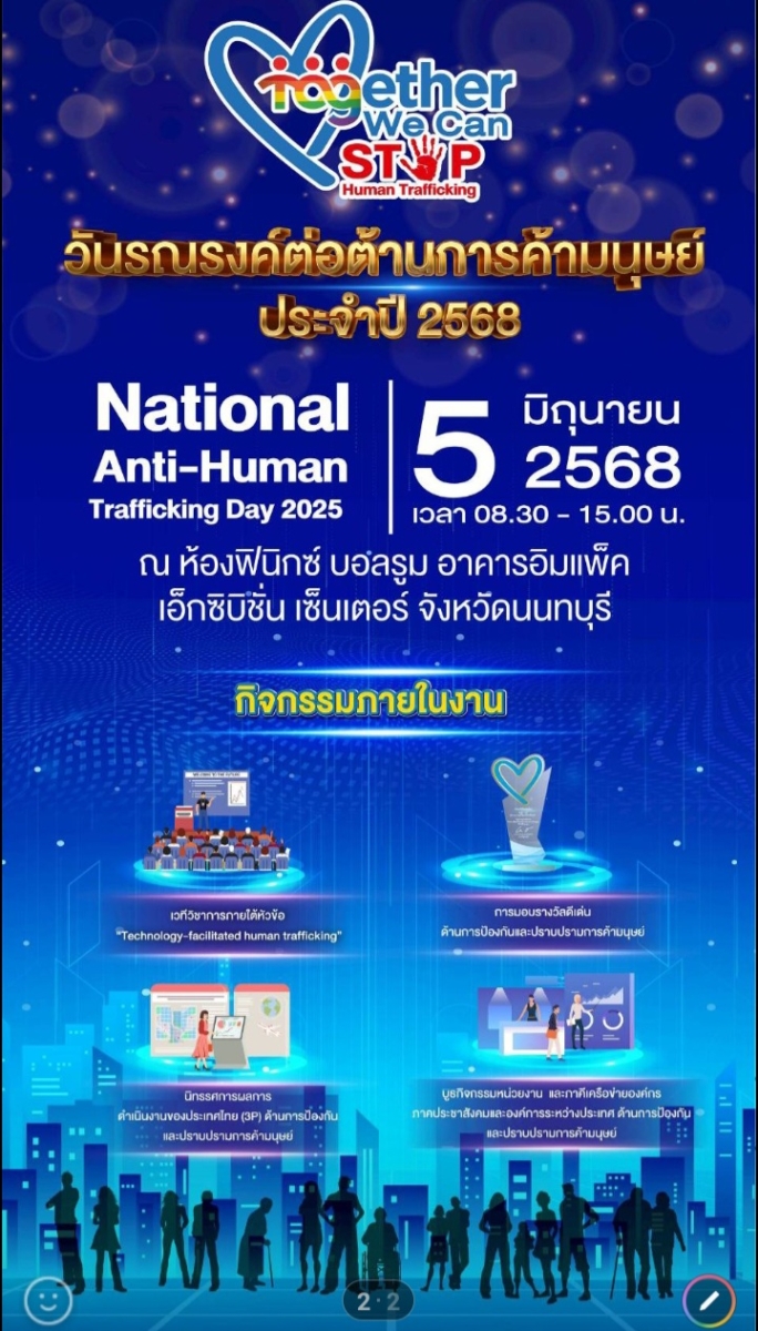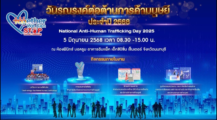กระทรวงการพัฒนาสังคมและความมั่นคงของมนุษย์ กำหนดจัดงานวันรณรงค์ต่อต้าน การค้ามนุษย์ ประจำปี ๒๕๖๘ ในวันพฤหัสบดีที่ ๕ มิ.ย. ๒๕๖๘ เวลา ๐๘.๓๐ – ๑๕.๐๐ น. ณ ห้องฟีนิกซ์ บอลรูม อาคารอิมแพ็ค เอ็กซิบิชั่น เซ็นเตอร์ จังหวัดนนทบุรี และถ่ายทอดสดผ่านทาง Facebook Live กองต่อต้านการค้ามนุษย์ สป.พม. เพื่อแสดงเจตนารมณ์ความมุ่งมั่นของรัฐบาลไทยในการป้องกันและปราบปรามการค้ามนุษย์ให้หมดสิ้นไปจากประเทศไทย หรือ Zero Tolerance รณรงค์เผยแพร่การดำเนินงานต่อต้านการค้ามนุษย์ของประเทศไทย สร้างความรู้ความเข้าใจที่ถูกต้องเกี่ยวกับการต่อต้านการค้ามนุษย์ให้แก่ประชาชน ภาคีเครือข่ายที่เกี่ยวข้อง ทั้งหน่วยงานภาครัฐส่วนกลางและส่วนภูมิภาค องค์กรพัฒนาเอกชน องค์การระหว่างประเทศ รวมทั้งสื่อมวลชน เพื่อผนึกกำลังของหน่วยงานที่เกี่ยวข้องของประเทศไทยในการป้องกันและปราบปรามการค้ามนุษย์ให้เห็นเป็นที่ประจักษ์และได้รับการยอมรับในเวทีระดับสากลต่อไป