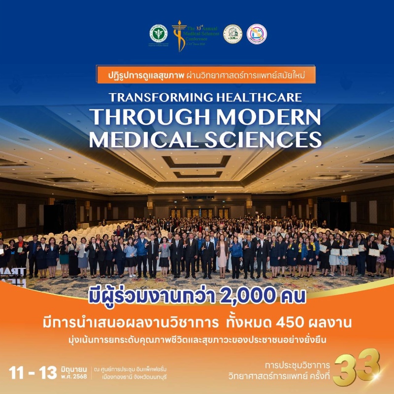 วันนี้ (13 มิถุนายน 2568) ที่ห้องแกรนด์ ไดมอนด์ บอลรูม ชั้น 2 ศูนย์การประชุมอิมแพ็ค ฟอรั่ม เมืองทองธานี จังหวัดนนทบุรี นายแพทย์ยงยศ ธรรมวุฒิ อธิบดีกรมวิทยาศาสตร์การแพทย์ เป็นประธานในพิธีมอบรางวัลชนะเลิศการนำเสนอผลงานวิชาการ ด้านวิจัยและพัฒนา (R&D) และผลงานวิชาการด้านพัฒนางานประจำสู่งานวิจัย (R2R) และปิดการประชุมวิชาการวิทยาศาสตร์การแพทย์ ครั้งที่ 33 ประจำปีงบประมาณ พ.ศ. 2568 ภายใต้หัวข้อ “Transforming Healthcare through Modern Medical Sciences ปฏิรูปการดูแลสุขภาพ ผ่านวิทยาศาสตร์การแพทย์สมัยใหม่”
