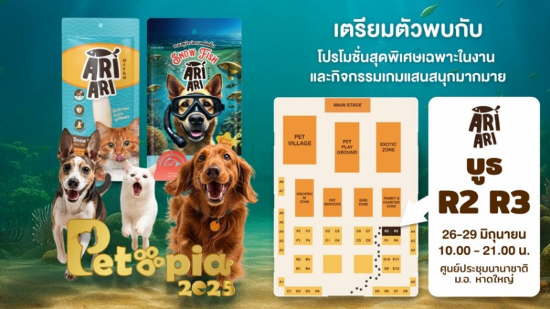 กลุ่มบริษัท พี.เอฟ.พี. (PFP) ผู้นำด้านการผลิตและจัดจำหน่ายผลิตภัณฑ์อาหารทะเลแปรรูปครบวงจร เดินหน้าขยายธุรกิจสู่ตลาดสัตว์เลี้ยงครั้งแรกในรอบ 40 ปี เปิดตัวแบรนด์ใหม่ “Ari Ari Pet Food” อย่างเป็นทางการในงาน Petopia Hatyai 2025 ระหว่างวันที่ 26 – 29 มิถุนายน 2568 ณ ศูนย์ประชุมนานาชาติฯ มหาวิทยาลัยสงขลานครินทร์ (ม.อ.) หาดใหญ่ จังหวัดสงขลา พบกันได้ที่บูธ R2 และ R3