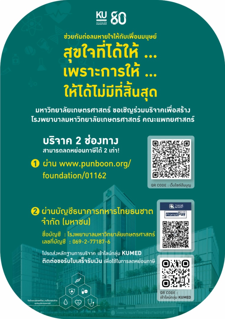 โอกาสนี้ จึงขอเชิญผู้มีจิตศรัทธา ร่วมทำบุญสร้างกุศลในการก่อสร้างคณะแพทยศาสตร์และสร้างโรงพยาบาลมหาวิทยาลัยเกษตรศาสตร์ โดยสามารถนำเงินบริจาคไปลดหย่อนภาษีได้ 2 เท่าและร่วมบริจาคได้ 2 ช่องทาง ดังนี้