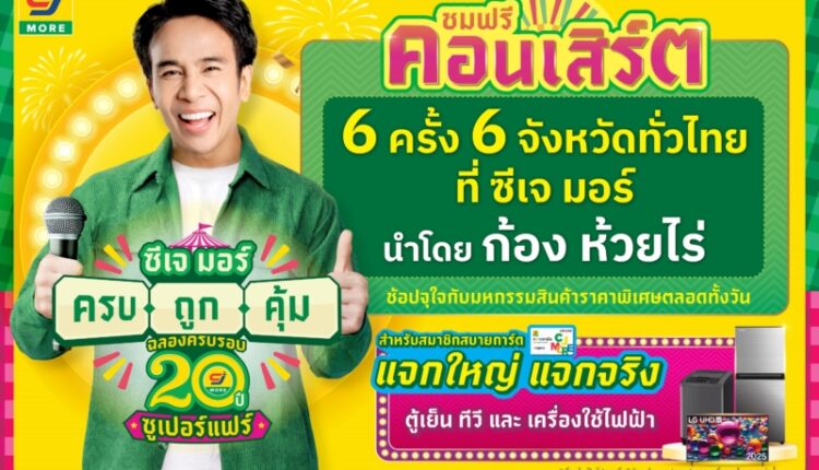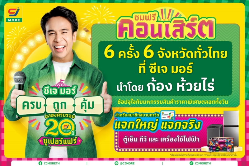 • นอกจากนี้ ยังมีความสนุกใกล้บ้านในงาน “ซีเจ มอร์ ครบ ถูก คุ้ม ฉลองครบรอบ 20 ปี ซูเปอร์แฟร์” ซึ่งจัดทั้งหมด 6 ครั้งใน 6 จังหวัดทั่วประเทศ ยกทัพศิลปินชื่อดัง นำโดย ก้อง ห้วยไร่ และศิลปินอีกมากมาย มาร่วมระเบิดความมันส์ในคอนเสิร์ต พร้อมมหกรรมของถูกสุดคุ้ม และกิจกรรมสนุก ๆ สำหรับลูกค้าสบายการ์ด ที่จะได้สิทธิลุ้นของรางวัลพิเศษภายในงาน ประเดิมที่แรกในวันที่ 5 ก.ค. 2568 ณ ซีเจ มอร์ สาขาเจ็ดแยก ต่อด้วย ชลบุรี สุราษฎร์ธานี สมุทรปราการ พิษณุโลก และปิดท้ายด้วยอุบลราชธานี จะจัดวันไหนและที่ไหนบ้าง รอติดตามได้เลย