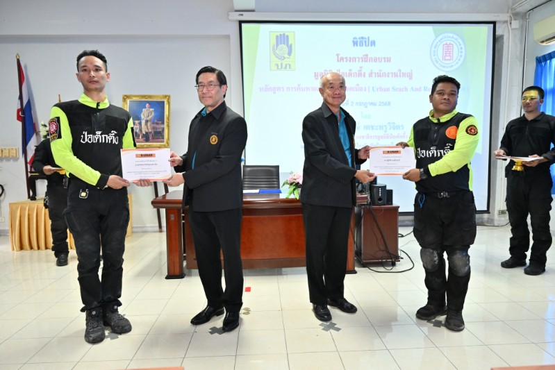 วันนี้ (วันพุธที่ 2 กรกฎาคม พ.ศ. 2568) มูลนิธิป่อเต็กตึ๊ง นำโดย นายสุรพงษ์ เตชะหรูวิจิตร กรรมการและรองเลขาธิการ พร้อมด้วย นายสุรพงศ์ เสรฐภักดี กรรมการและรองเหรัญญิก เป็นประธานมอบใบวุฒิบัตรให้แก่ทีมบรรเทาสาธารณภัย ที่สำเร็จการฝึกอบรมหลักสูตร “การค้นหาและกู้ภัยในเขตเมือง (Urban Search And Rescue) หรือ “USAR” เป็นโครงการฝึกอบรมที่มูลนิธิป่อเต็กตึ๊ง ร่วมกับ กรมป้องกันและบรรเทาสาธารณภัย กระทรวงมหาดไทย ซึ่งกำหนดจัดขึ้นระหว่างวันที่ 23 มิถุนายน – 2 กรกฎาคม พ.ศ. 2568