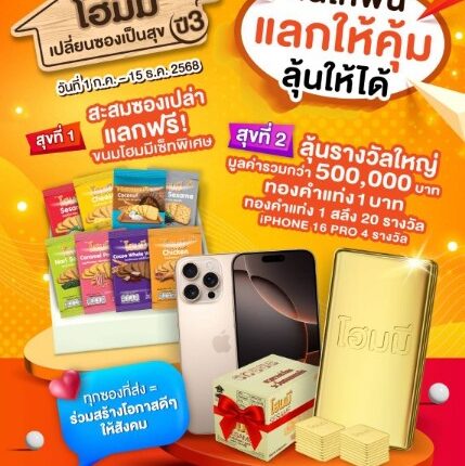 โฮมมี เปลี่ยนซองเป็นสุข ปี 3 เริ่มแล้ว! เพียงซื้อ ‘โฮมมี’ สะสมซองแล้วนำมา แลก & ลุ้น ทองคำแแท่งและของรางวัลอื่นๆ มูลค่ารวมกว่า 500,000 บาท ตั้งแต่วันนี้ – 15 ธ.ค. 68