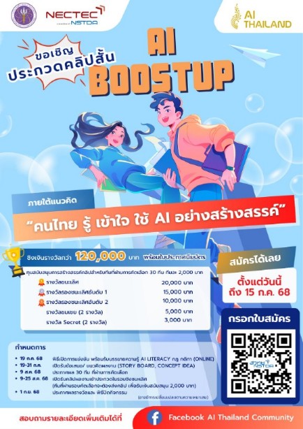 ศูนย์เทคโนโลยีอิเล็กทรอนิกส์และคอมพิวเตอร์แห่งชาติ (เนคเทค) สำนักงานพัฒนาวิทยาศาสตร์และเทคโนโลยีแห่งชาติ (สวทช.) ขอเชิญชวนผู้สนใจ ไม่จำกัดอายุ ระดับการศึกษา หรืออาชีพ ร่วมกิจกรรมประกวดคลิปสั้น AI BoostUP ภายใต้แนวคิด “คนไทย รู้ เข้าใจ ใช้ AI อย่างสร้างสรรค์” เพื่อสร้างความเข้าใจและตระหนักรู้ถึงการประยุกต์ใช้ AI ในชีวิตประจำวันได้อย่างถูกต้องเหมาะสม และเป็นส่วนหนึ่งในการขับเคลื่อนสังคมไทยให้รู้เท่าทันการใช้เทคโนโลยี AI ลุ้นชิงเงินรางวัลรวมมูลค่ากว่า 100,000 บาท
