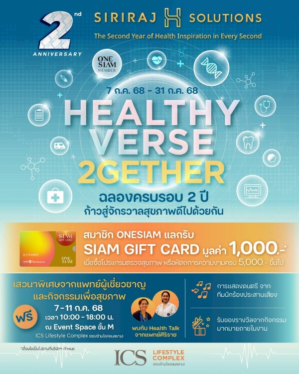นอกจากนี้ เพื่อร่วมฉลองให้กับความสำเร็จในปีที่ 2 ก้าวสู่ปีที่ 3 ของ SIRIRAJ H SOLUTIONS ไอซีเอส ยังมอบโปรโมชั่นพิเศษสุดเอ็กคลูซีฟ “The 2nd Anniversary Healthy Verse 2Gether” ให้สมาชิก ONESIAM ที่ซื้อโปรแกรมตรวจสุขภาพหรือหัตถการความงาม และนวดไทยแบบราชสำนัก กับ SIRIRAJ H SOLUTIONS ครบ 5,000 บาทขึ้นไป แลกรับ SIAM GIFT CARD มูลค่า 1,000 บาท ได้ทันที จำนวน 100 สิทธิ์ตลอดรายการ รวมมูลค่า 100,000 บาท ตั้งแต่วันที่ 7 – 31 กรกฎาคม 2568 ติดตามเงื่อนไขการรับรางวัลได้ที่เฟสบุ๊ก ICS