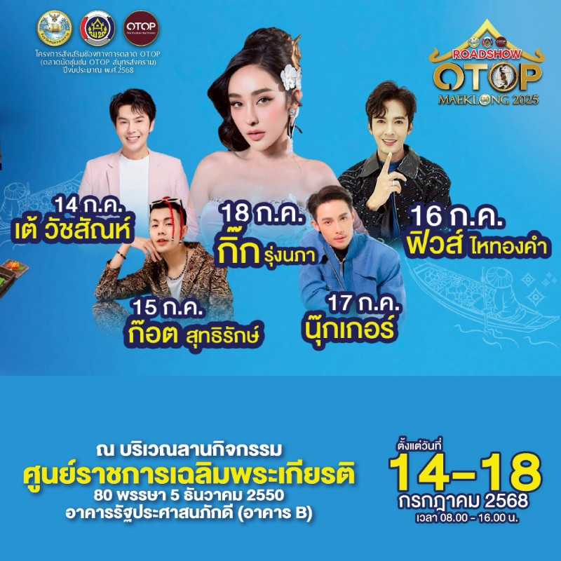 ROADSHOW OTOP MAEKLONG 2025 ยกทัพของดีจังหวัดสมุทรสงคราม บุกกลางกรุง! 14–18 ก.ค. 2568 ที่ลานอเนกประสงค์ อาคาร B ศูนย์ราชการฯ 80 พรรษา แจ้งวัฒนะช้อปเพลิน กับสินค้า OTOP สมุทรสงคราม