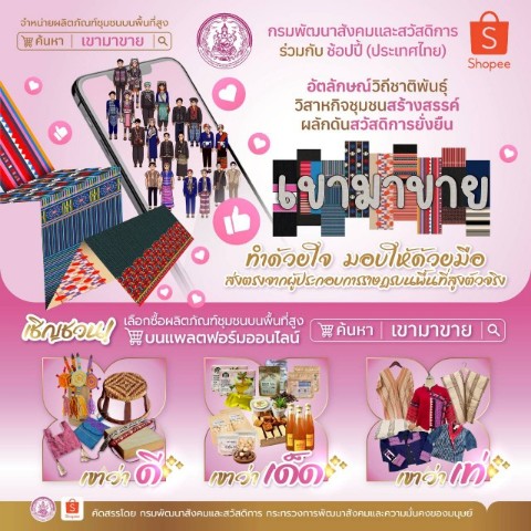 กรมพัฒนาสังคมและสวัสดิการ ร่วมกับ Shopee จัดกิจกรรม “เขามาขาย” เพื่อส่งเสริมการจำหน่ายผลิตภัณฑ์ชุมชนบนพื้นที่สูง และเพิ่มช่องจัดจำหน่ายผลิตภัณฑ์ชุมชนบนพื้นที่สูงผ่านแพลตฟอร์มออนไลน์ ให้กับราษฎรบนพื้นที่สูงที่มีการรวมกลุ่มเพื่อการจัดสวัสดิการสังคมชุมชนบนพื้นที่สูง บนแอปพลิเคชัน Shopee (search “เขามาขาย”) หรือเข้าเว็บไซต์ https://shopee.co.th/m/dsdw พร้อมรับส่วนลด 20% เมื่อซื้อผลิตภัณฑ์ชุมชนบนพื้นที่สูงในกิจกรรมฯ