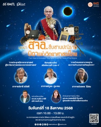 สถาบันเทคโนโลยีพระจอมเกล้าเจ้าคุณทหารลาดกระบัง (สจล.) ขอเชิญชวนผู้สนใจเข้าร่วมงานเสวนาในหัวข้อ “สจล. สืบสานปณิธานบิดาแห่งวิทยาศาสตร์ไทย” (From Vision to Innovation: King Rama IV and the Future of Thai Science) เนื่องในโอกาสวันคล้ายวันสถาปนาสถาบันฯ ครบรอบ 65 ปี และวันวิทยาศาสตร์ไทย เพื่อเทิดพระเกียรติพระบาทสมเด็จพระจอมเกล้าเจ้าอยู่หัว รัชกาลที่ 4 “พระบิดาแห่งวิทยาศาสตร์ไทย” และส่งเสริมการเรียนรู้ด้านวิทยาศาสตร์ควบคู่กับประวัติศาสตร์ วัฒนธรรม และภูมิปัญญาไทย
