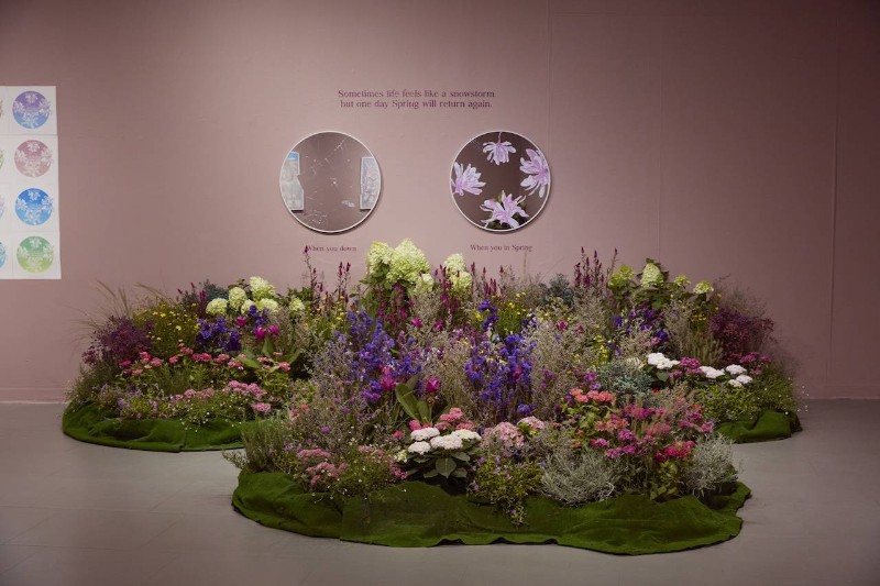 “จริง ๆ แล้วผมรักทุกภาพเลยครับ แต่ภาพที่ผูกพันมากที่สุดคือ ‘Mind’s garden’เป็นสวนที่มีดอกซากุระผลิบานทั้งสองข้างทาง ผมชอบนอนเล่นใต้ต้นซากุระ เฝ้ามองความสวยงามของดอกซากุระสีชมพู ท่ามกลางผู้คนที่มาปิคนิค หรือนอนอ่านหนังสืออย่างผ่อนคลาย เป็นช่วงเวลาที่สัมผัสได้ถึงความสุขสงบและรู้สึกว่าโลกใบนี้ช่างงดงามมากจริง ๆ การทำงานในคอลเล็กชันนี้ทำให้ผมสัมผัสถึงความละมุนละไมและด้านที่อ่อนโยนของตัวเองมากขึ้น ผมปล่อยให้ตัวเองทำงานอย่างเนิบช้าและสร้างรายละเอียดเล็ก ๆ ในภาพวาด เพื่อให้ภาพทำหน้าที่เล่าเรื่องในแบบของตัวเอง”