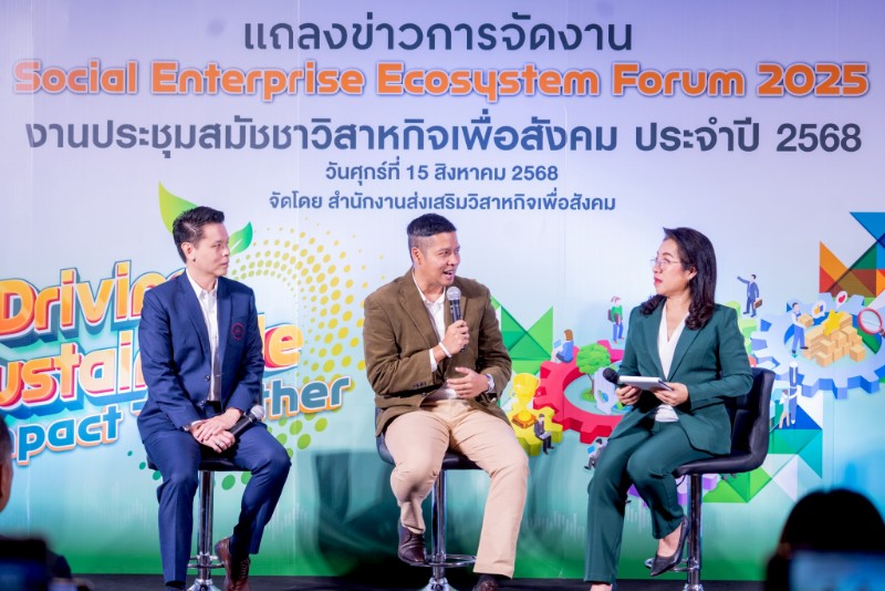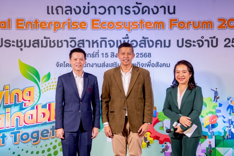 (15 ส.ค.68) สำนักงานส่งเสริมวิสาหกิจเพื่อสังคม (สวส.) แถลงข่าวการจัดงาน Social Enterprise Ecosystem Forum 2025 (ประชุมสมัชชาวิสาหกิจเพื่อสังคม ประจำปี 2568) ณ อาคารเอนกประสงค์ สถานีวิทยุโทรทัศน์กองทัพบก (ททบ.5) โดย นายธนาวุฒิ ศุภางคะรัตน์ หัวหน้าส่วนส่งเสริมและยกระดับวิสาหกิจเพื่อสังคม เลขานุการการประชุมสมัชชาวิสาหกิจเพื่อสังคม ประจำปี 2568 สำนักงานส่งเสริมวิสาหกิจเพื่อสังคม และผู้ช่วยศาสตราจารย์ ดร.สันติ เติมประเสริฐสกุล รองอธิการบดีฝ่ายการคลังและทรัพย์สิน รักษาการแทนคณบดีคณะบริหารธุรกิจเพื่อสังคม มหาวิทยาลัยศรีนครินทรวิโรฒ ร่วมแถลงข่าวการจัดงานประชุม
