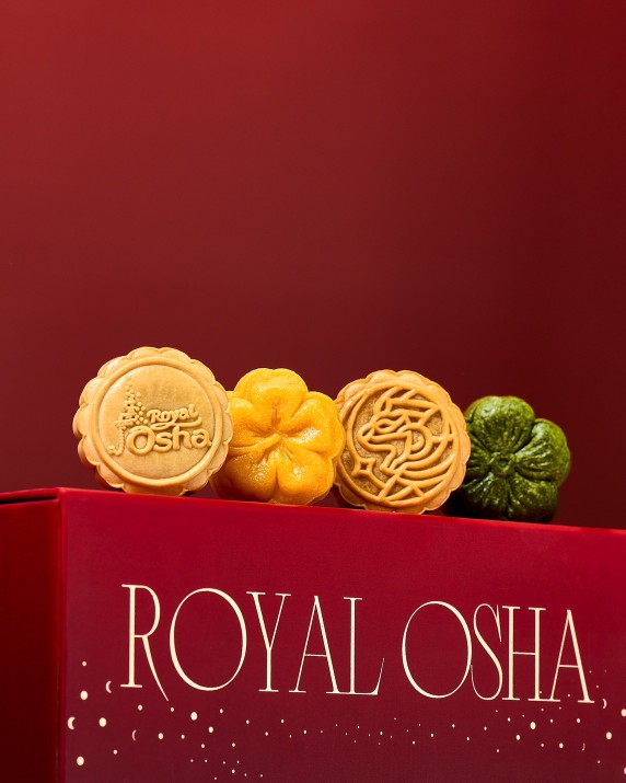โลโก้ รอยัล โอชา และตัวหนังสือสีทองประกายของแสงจันทร์ ประกอบด้วย ขนมไหว้พระจันทร์ จำนวน 8 ชิ้น รวมไส้มาทั้งหมด 4 รสชาติซิกเนเจอร์ โดยมี ไส้คัสตาร์ด 2 ชิ้น, ไส้ทุเรียนไข่เค็ม 2 ชิ้น, ไส้เม็ดบัวเม็ดแตงโม 2 ชิ้น และ ไส้มัทฉะพิสตาชิโอ (ใหม่) 2 ชิ้น ในราคา 988 บาท