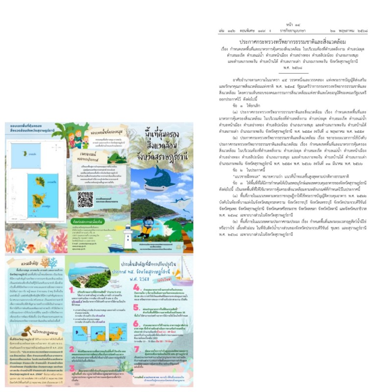 สามารถดาวน์โหลดประกาศกระทรวงทรัพยากรธรรมชาติและสิ่งแวดล้อม เรื่อง กำหนดเขตพื้นที่และมาตรการคุ้มครองสิ่งแวดล้อม ในบริเวณท้องที่ตำบลตลิ่งงาม ตำบลบ่อผุด ตำบลมะเร็ต ตำบลแม่น้ำ ตำบลหน้าเมือง ตำบลอ่างทอง ตำบลลิปะน้อย อำเภอเกาะสมุย และตำบลเกาะพะงัน ตำบลบ้านใต้ ตำบลเกาะเต่า อำเภอเกาะพะงัน จังหวัดสุราษฎร์ธานี พ.ศ. 2568 ฉบับใหม่ ประกาศในราชกิจจานุเบกษา ฉบับประกาศและงานทั่วไป เล่ม 142 ตอนพิเศษ 199 ง ลงวันที่ 21 พฤษภาคม 2568 มีผลใช้บังคับตั้งแต่วันที่ 22 พฤษภาคม 2568 เป็นต้นไป ได้ที่ https://ratchakitcha.soc.go.th/documents/70055.pdf