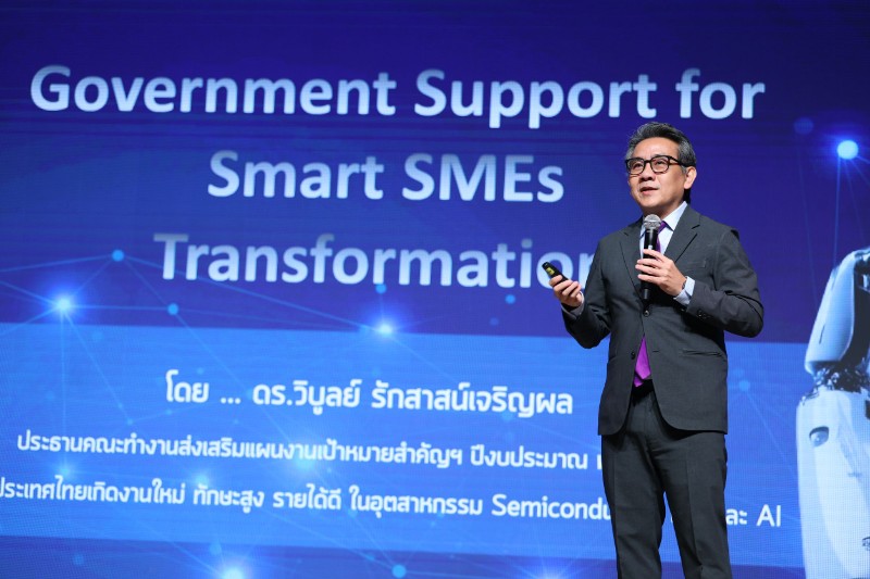 ด้าน ดร.วิบูลย์ รักสาสน์เจริญผล ประธานคณะกรรมการส่งเสริมแผนงานเป้าหมายสำคัญของเป้าหมายสำคัญฯ เรื่อง “ประเทศไทยเกิดงานใหม่ ทักษะสูง รายได้ดี ใน 3 อุตสาหกรรม (Semiconductor, EV และ AI)” จากหน่วยบริหารและจัดการทุนด้านการพัฒนากำลังคนและทุนด้านการพัฒนาสถาบันอุดมศึกษาการวิจัยและการสร้างนวัตกรรม (บพค.) ได้บรรยายพิเศษในหัวข้อ “Government Support for Smart SMEs Transformation” โดยกล่าวว่า “นโยบายภาครัฐมุ่งสนับสนุนการเปลี่ยนผ่านของ SMEs สู่ระบบดิจิทัล เพื่อเสริมสร้างศักยภาพและเพิ่มขีดความสามารถในการแข่งขันทั้งในประเทศและต่างประเทศ โดยมาตรการสนับสนุนครอบคลุมหลายด้าน อาทิ การจัดหาแหล่งเงินทุน โครงการพัฒนาทักษะและศักยภาพบุคลากร รวมถึงการส่งเสริมความร่วมมือระหว่างภาคส่วนต่างๆ ทั้งนี้เชื่อมั่นว่าการก้าวสู่ยุคดิจิทัลของ SMEs จะเป็นรากฐานสำคัญในการเสริมความแข็งแกร่งให้กับเศรษฐกิจไทยด้วยการเพิ่มประสิทธิภาพการดำเนินงาน ลดต้นทุน และสร้างโอกาสในการขยายตลาดทั้งในและต่างประเทศ”