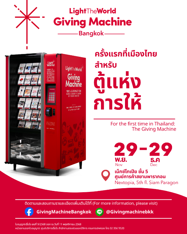 กรุงเทพฯ ประเทศไทย: 21 พฤศจิกายน 2568 — ปรากฏการณ์การกุศลระดับโลกกำลังเดินทางมาถึงประเทศไทย กับการเปิดตัวตู้บริจาค Light the World Giving Machine เป็นครั้งแรกในเอเชียตะวันออกเฉียงใต้ ที่ NEXTOPIA สยามพารากอน ในวันที่ 29 พฤศจิกายนนี้ เปิดโอกาสให้ประชาชนเลือกบริจาคสิ่งจำเป็นผ่านประสบการณ์คล้ายตู้จำหน่ายสินค้าอัตโนมัติ แต่เปลี่ยนจากสินค้าเป็นการมอบความช่วยเหลือให้ผู้ด้อยโอกาส โครงการนี้ได้รับการสนับสนุนโดยศาสนจักรของพระเยซูคริสต์แห่งวิสุทธิชนยุคสุดท้าย (The Church of Jesus Christ of Latter-day Saints) ซึ่งเป็นผู้รับผิดชอบค่าใช้จ่ายในการดำเนินงานทั้งหมด ทำให้ยอดเงินบริจาคเต็มจำนวน 100% ถูกส่งต่อไปยังองค์กรการกุศลที่ผ่านการกลั่นกรองตรวจสอบมาเรียบร้อยแล้ว