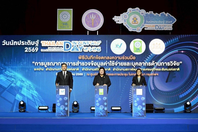 ดร.วิภารัตน์ ดีอ่อง ผู้อำนวยการสำนักงานการวิจัยแห่งชาติ ดร. เอกพงษ์ หริ่มเจริญ ผู้อำนวยการสำนักงานสถิติแห่งชาติ นางสาวนภัสชล ทองสมจิตร ที่ปรึกษาด้านนโยบายและแผนงานสำนักงานสภาพัฒนาการเศรษฐกิจและสังคมแห่งชาติ เป็นผู้ลงนาม MOU ซึ่งจัดขึ้นในงาน “วันนักประดิษฐ์ 2569 (Thailand Inventors’ Day 2026) ภายใต้แนวคิด “ปลดล็อกประเทศไทยด้วยพลังของสิ่งประดิษฐ์และนวัตกรรม Unlock Thailand – Power of Invention and Innovation” ณ เวทีกลาง Event Hall 102–103 ศูนย์นิทรรศการและการประชุมไบเทค บางนา กรุงเทพมหานคร