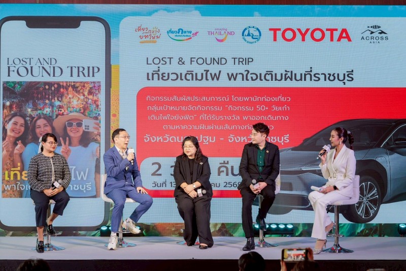 กิจกรรม Lost & found Trip เที่ยวปลุกไฟ ใจปลุกฝัน ททท. ร่วมกับ บริษัท โตโยต้า มอเตอร์ ประเทศไทย จำกัด และบริษัท อะครอส เอเชีย จำกัด ร่วมกันออกแบบสินค้าและบริการในรูปแบบเส้นทางท่องเที่ยวจังหวัดเมืองน่าเที่ยวในภาคกลาง เพื่อตอบโจทย์ไลฟ์สไตล์ ความสนใจ และความต้องการที่หลากหลาย โดยพานักท่องเที่ยวกลุ่มเป้าหมายที่ได้รับรางวัลสัมผัสประสบการณ์กับกิจกรรม “50+ วัยเก๋า เติมไฟใจยังฟิต” ออกเดินทางตามหาความฝันผ่านเส้นทาง ท่องเที่ยวจังหวัดนครปฐม – ราชบุรี ทั้งนี้ บริษัท โตโยต้า มอเตอร์ ประเทศไทย จำกัด ได้มีการสนับสนุนการเดินทางหลากหลายรูปแบบภายใต้แนวคิด Multi-Pathway ผ่านการสนับสนุนยานยนต์พลังงานทางเลือก พร้อมพนักงานขับรถ อาทิ รถยนต์ไฟฟ้า (BEV), รถยนต์ปลั๊กอินไฮบริด (PHEV) และรถยนต์ไฮบริด (HEV) มูลค่ามากกว่า 300,000 บาท