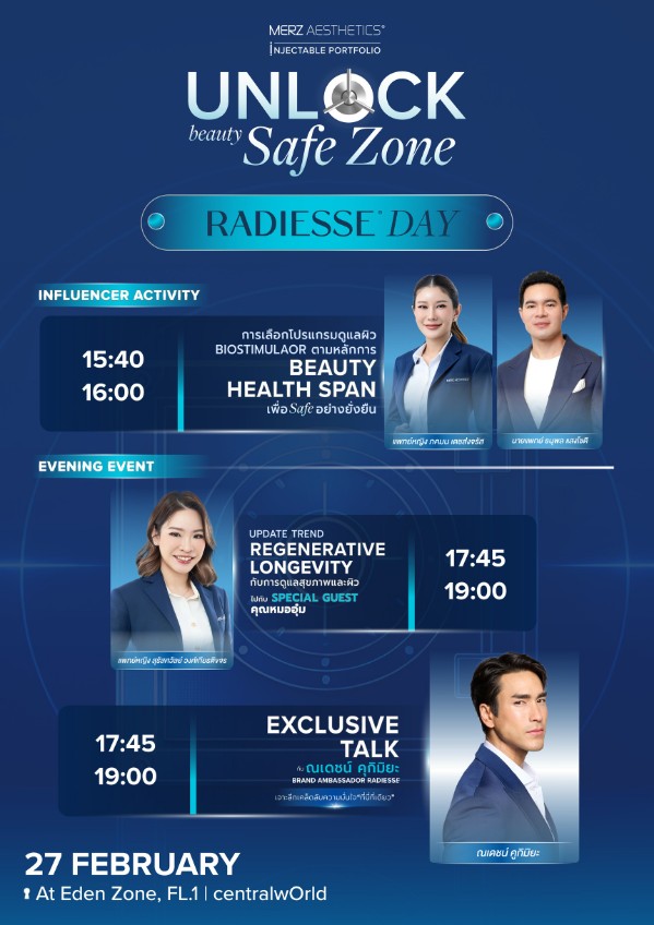 ร่วมปลดล็อกความสวยเซฟด้วยมาตรฐานความปลอดภัยสูงสุดในงาน “UNLOCK BEAUTY SAFE ZONE” ได้ตั้งแต่วันที่ 27 กุมภาพันธ์ – 1 มีนาคม 2569 ณ โซนอีเดน ชั้น 1 ศูนย์การค้าเซ็นทรัลเวิลด์ ติดตามรายละเอียดเพิ่มเติมได้ที่ Facebook: Merz Aesthetics Thailand และ Line OA @merzbeautyconnect