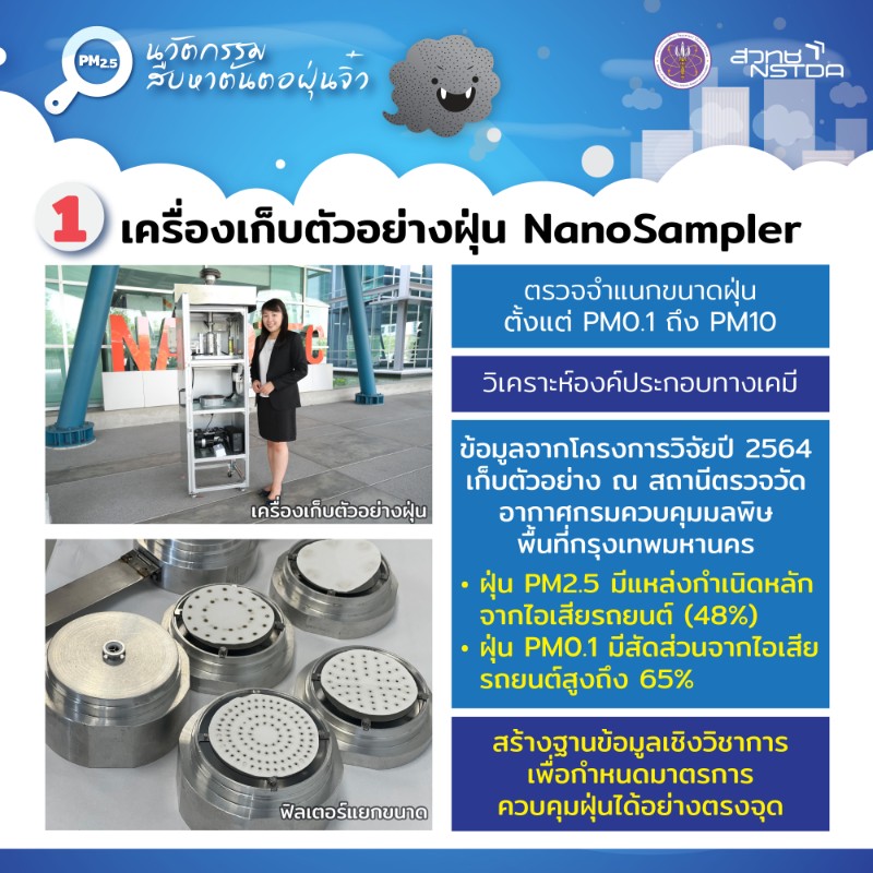 นวัตกรรมชุดแรกมุ่งเน้นการสืบหาต้นตอของฝุ่น PM2.5 เพื่อให้การแก้ปัญหามีความแม่นยำ โดยนาโนเทค สวทช. ร่วมกับจุฬาลงกรณ์มหาวิทยาลัยและกรมควบคุมมลพิษ ได้พัฒนา “เครื่องเก็บตัวอย่างฝุ่น NanoSampler” ภายใต้โครงการวิจัย