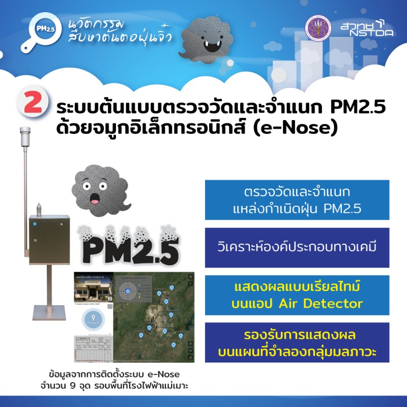 ที่ได้รับทุนสนับสนุนจากสำนักงานการวิจัยแห่งชาติ (วช.) ซึ่งสามารถแยกและวิเคราะห์ฝุ่นได้ถึง 6 ระดับขนาด ผลการศึกษาพบว่า เกือบครึ่งหนึ่งของฝุ่น PM2.5 ในพื้นที่กรุงเทพมหานครมาจากไอเสียรถยนต์ และในกลุ่มฝุ่นจิ๋ว PM0.1 มีสัดส่วนจากไอเสียรถยนต์สูงถึงร้อยละ 65 ข้อมูลดังกล่าวเป็นฐานสำคัญต่อการกำหนดมาตรการควบคุมมลพิษจากภาคคมนาคมอย่างตรงจุด นอกจากนี้ นาโนเทคยังมีการพัฒนา “ระบบตรวจวัดและจำแนก PM2.5 ด้วยจมูกอิเล็กทรอนิกส์ (e-Nose)” ที่สามารถระบุแหล่งกำเนิดฝุ่นแบบเรียลไทม์ พร้อมแสดงผลผ่านแอปพลิเคชัน Air Detector เพื่อสนับสนุนการบริหารจัดการสิ่งแวดล้อมเชิงพื้นที่อย่างมีประสิทธิภาพ