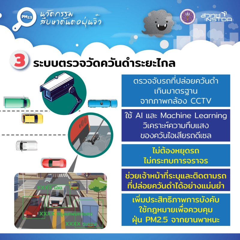 ขณะเดียวกัน เอ็นเทคและเนคเทค สวทช. ร่วมกับสถาบันเทคโนโลยีแห่งเอเชีย (AIT) สำนักงานการวิจัยแห่งชาติ (วช.) และสำนักงานคณะกรรมการส่งเสริมวิทยาศาสตร์ วิจัยและนวัตกรรม (สกสว.) ได้พัฒนา “ระบบตรวจวัดควันดำแบบระยะไกล” โดยผสานเทคโนโลยี AI, Machine Learning และ Computer Vision เปลี่ยนกล้อง CCTV ให้สามารถตรวจจับรถที่ปล่อยมลพิษเกินมาตรฐานได้โดยไม่ต้องหยุดรถ ช่วยเพิ่มประสิทธิภาพการบังคับใช้กฎหมายโดยไม่กระทบการจราจร