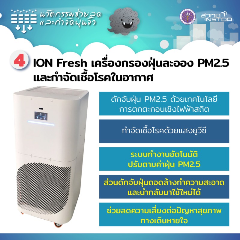 นวัตกรรมชุดที่สองมุ่งลดและกำจัดฝุ่นในพื้นที่อยู่อาศัย โดยเนคเทค สวทช. พัฒนา “ION Fresh เครื่องกรองฝุ่น PM2.5 และกำจัดเชื้อโรคในอากาศ” ที่ใช้เทคโนโลยีการตกตะกอนเชิงไฟฟ้าสถิตในการดักจับฝุ่น PM2.5 และกำจัดเชื้อโรคด้วยแสง UVC เครื่องนี้รองรับการใช้งานภายในห้องขนาด 250 ตารางเมตร และสามารถถอดล้างส่วนดักจับฝุ่นเพื่อนำกลับมาใช้ใหม่ได้ ตอบโจทย์ทั้งการลดความเสี่ยงโรคทางเดินหายใจและประหยัดค่าใช้จ่าย