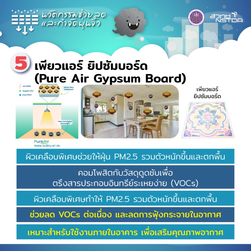 ในยุคที่มลพิษทางอากาศไม่ได้อยู่แค่ภายนอกอาคาร แต่แฝงตัวอยู่ภายในอาคารด้วย เอ็มเทค สวทช. ร่วมกับการไฟฟ้าฝ่ายผลิตแห่งประเทศไทย (กฟผ.) ได้พัฒนา “เพียวแอร์ ยิปซัมบอร์ด (Pure Air Gypsum Board)” ซึ่งเป็นวัสดุก่อสร้างภายในอาคารที่สามารถดูดซับสารประกอบอินทรีย์ระเหยง่าย (VOCs) ด้วยพันธะเคมี และเคลือบสีพิเศษที่ช่วยให้ฝุ่น PM2.5 หนักขึ้นแล้วตกลงสู่พื้น ลดการฟุ้งกระจายในอากาศ สร้างสภาพแวดล้อมในที่อยู่อาศัยให้ปลอดภัยยิ่งขึ้น