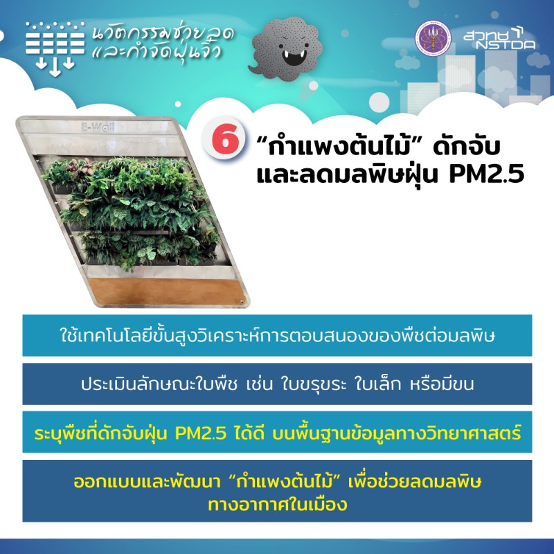 นอกจากนี้ การใช้พลังจากธรรมชาติก็เป็นอีกหนึ่งทางเลือกที่ยั่งยืน สถาบันพัฒนาและฝึกอบรมโรงงานต้นแบบ และคณะทรัพยากรชีวภาพและเทคโนโลยี มหาวิทยาลัยเทคโนโลยีพระจอมเกล้าธนบุรี (มจธ.) ร่วมกับศูนย์โอมิกส์แห่งชาติ ไบโอเทค สวทช. ได้วิจัยพัฒนา “กำแพงต้นไม้” เพื่อดักจับและดูดซับ PM2.5 โดยใช้เทคโนโลยีขั้นสูงอย่างเมตาโบโลมิกส์ (Metabolomics) และการวิเคราะห์ด้วย LC-MS เพื่อค้นหาและระบุชนิดพืชที่เหมาะสมที่สุดในการจับฝุ่นบนพื้นฐานทางวิทยาศาสตร์อย่างแท้จริง เช่น พืชที่มีลักษณะใบขรุขระ ใบเล็ก หรือมีขนบนใบ อาทิ โมก กัลปพฤกษ์ จามจุรี ประดู่ และพะยูง เพื่อนำไปออกแบบการปลูกกำแพงต้นไม้ที่มีประสิทธิภาพสูง ช่วยเพิ่มทางเลือกการแก้ปัญหามลพิษทางอากาศอย่างเป็นมิตรต่อสิ่งแวดล้อม