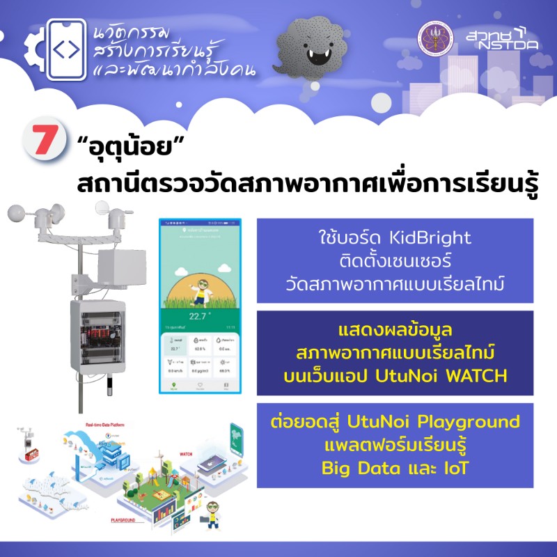 ปิดท้ายด้วย “อุตุน้อย (UtuNoi) สถานีตรวจวัดสภาพอากาศเพื่อการเรียนรู้” โดยเนคเทค สวทช. ได้ต่อยอดจากบอร์ด KidBright ด้วยการติดตั้งเซนเซอร์วัดสภาพอากาศต่าง ๆ แล้วส่งข้อมูลไปยังเว็บแอปพลิเคชันแบบเรียลไทม์ ซึ่งเปิดโอกาสให้เยาวชนได้เรียนรู้การใช้ข้อมูลจริง ฝึกทักษะด้าน Big Data และ IoT เพื่อสร้างรากฐานนักพัฒนานวัตกรรมสิ่งแวดล้อมในอนาคต