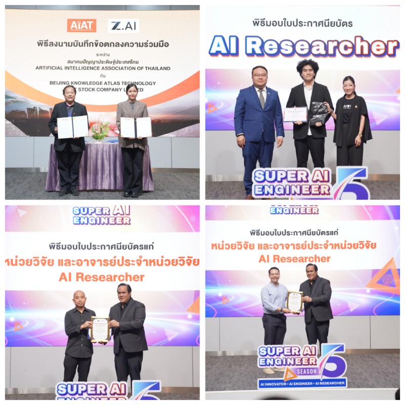 วันที่ 13 มีนาคม 2569 สมาคมปัญญาประดิษฐ์ประเทศไทย (Artificial Intelligence Association of Thailand: AIAT) จัดงาน พิธีปิดโครงการ Super AI Engineer Season 5 และ พิธีเปิดโครงการ Super AI Engineer Season 6 ณ ห้องแถลงข่าว ชั้น 1 อาคารพระจอมเกล้า สำนักงานปลัดกระทรวงการอุดมศึกษา วิทยาศาสตร์ วิจัยและนวัตกรรม (อว.) เพื่อสรุปผลการดำเนินงานของโครงการพัฒนาศักยภาพบุคลากรด้านปัญญาประดิษฐ์ของประเทศไทย “Super AI Engineer Season 5” พร้อมประกาศเดินหน้าการพัฒนากำลังคนด้าน AI อย่างต่อเนื่องใน “Super AI Engineer Season 6”