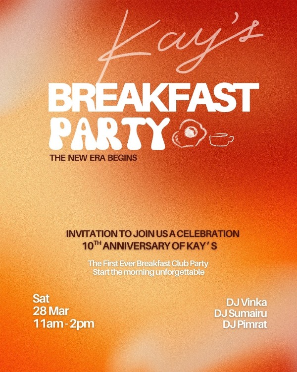 Kay’s ร้านอาหารเช้าและบรันช์ชื่อดังของกรุงเทพฯ (Best Brunch in Bangkok) ชวนร่วมเฉลิมฉลองครบรอบ 10 ปี กับงาน “Kay’s Breakfast Party” ปาร์ตี้มื้อเช้าที่รวมอาหาร ดนตรี และกิจกรรมสุดครีเอทีฟไว้ในบรรยากาศคอมมูนิตี้ของคนรักอาหารเช้า ในวันเสาร์ที่ 28 มีนาคม 2569 เวลา 11.00 – 14.00 น. ณ Kay’s Sukhumvit 49 (โครงการ YARD 49) ผู้สนใจสามารถซื้อบัตรเข้าร่วมงานผ่าน Line Official @kaysboutique ได้ในราคา 1,290 บาทต่อท่าน รวม Unlimited Food, เครื่องดื่ม 2 แก้ว และสิทธิ์ร่วมทุกกิจกรรมภายในงาน