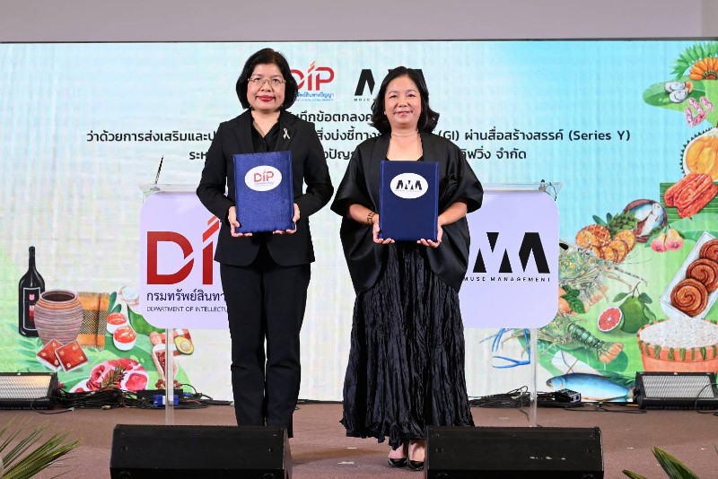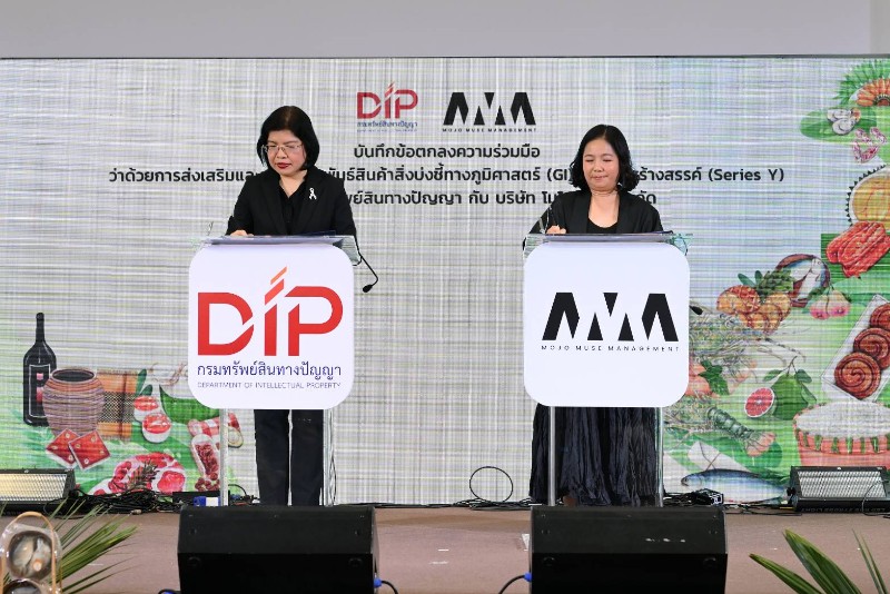 นางอรมน ทรัพย์ทวีธรรม อธิบดีกรมทรัพย์สินทางปัญญา เปิดเผยว่า กรมทรัพย์สินทางปัญญา เดินหน้านโยบายเชิงรุกยกระดับสินค้า GI ไทยสู่สากลและเสริมสร้างการรับรู้ในวงกว้าง ผ่านการลงนามบันทึกข้อตกลงความร่วมมือ (MOU) ร่วมกับ Mojo Muse Management บริษัทผู้ผลิตสื่อสร้างสรรค์ชั้นนำของไทย โดยมี นางสาวอนุษฐา เชาว์วิศิษฐ กรรมการผู้จัดการ บริษัท โมโจลิฟวิ่ง จำกัด ร่วมลงนาม MOU พร้อมศิลปินในสังกัด อาทิ นายปรัตถกร ดวงสว่าง (ปีเตอร์) นายอภิสิทธิ์ แสงมิ่ง (บี) นางสาวธนัชชา เทพหัสดิน ณ อยุธยา (อิง) และนางสาวรัมณียา บรรดาประณีต บุณยทรรพ (มีน่ากิ) ร่วมเป็นสักขีพยานในความร่วมมือเพื่อนำเสนออัตลักษณ์สินค้า GI ไทย วิถีชีวิต และเรื่องราวของชุมชนผู้ผลิต GI ผ่านสื่อบันเทิงในรูปแบบต่างๆ ทั้งโทรทัศน์ สื่อออนไลน์ และสื่อสิ่งพิมพ์ มุ่งเจาะตลาดกลุ่มคนรุ่นใหม่และขยายฐานผู้บริโภคในต่างประเทศให้กว้างขึ้น