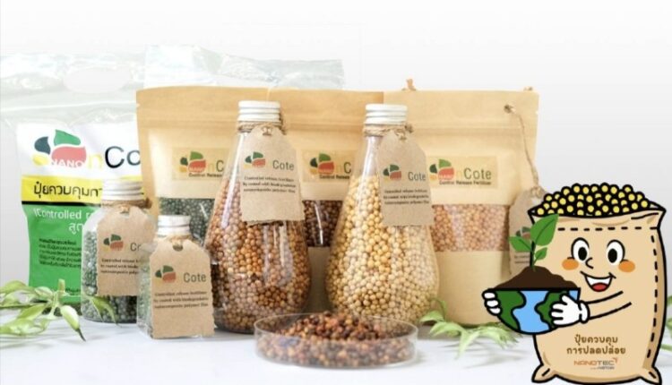 ในขณะเดียวกัน พื้นที่เกษตรกรรมสำหรับพืชเศรษฐกิจอย่างข้าว อ้อย ข้าวโพด ก็ช่วยโลกได้ โดย นาโนเทค สวทช. พัฒนา “NANO nCote (นาโน เอ็นโคต)” ปุ๋ยควบคุมการปลดปล่อย ด้วยเทคโนโลยีการเคลือบสารนาโนคอมพอสิตจากพอลิเมอร์ฐานชีวภาพบนเม็ดปุ๋ย โดยสารเคลือบดังกล่าวมีลักษณะเป็นเสมือนฟิล์มห่อหุ้มเม็ดปุ๋ย จึงสามารถช่วยควบคุมการปลดปล่อยธาตุอาหารได้อย่างต่อเนื่อง จากสมบัติที่ละลายน้ำเร็วเกินไปของปุ๋ยเคมีทั่วไปทำให้พืชดูดซึมใช้งานไม่ทัน ก่อให้เกิดการสูญเสียธาตุอาหาร และเกิดผลกระทบต่อสิ่งแวดล้อมตามมา เช่น การระเหิดของปุ๋ยเป็นหนึ่งในตัวการของการปล่อยก๊าซเรือนกระจก โดยเฉพาะก๊าซไนตรัสออกไซด์ (N2O) ที่มีศักยภาพทำให้โลกร้อนสูงกว่าคาร์บอนไดออกไซด์ (CO2) ถึง 265 เท่า รวมถึงปรากฏการณ์สาหร่ายบานสะพรั่งจนส่งผลกระทบต่อแหล่งน้ำ ซึ่งนวัตกรรมนอกจากจะช่วยให้พืชดูดซึมธาตุอาหารได้อย่างเต็มประสิทธิภาพ ยังช่วยให้เกษตรกรบริหารจัดการแปลงปลูกได้ง่ายขึ้น กล่าวคือ สามารถออกแบบให้ควบคุมการปลดปล่อยได้ยาวนานมากกว่า 6 เดือน จึงสามารถใส่ปุ๋ยเพียงครั้งเดียวต่อระยะการปลูก โดยผ่านการพิสูจน์ระดับภาคสนามจากการปลูกอ้อย ข้าว ข้าวโพด เป็นต้น จึงสามารถลดต้นทุนค่าแรงงาน ลดอัตราการใส่ปุ๋ยให้กับเกษตรกรได้ อีกทั้งปัจจุบันเกษตรกรของไทยกำลังเผชิญวิกฤตปุ๋ยแพง และแรงงานที่หายากมากขึ้น นวัตกรรมนี้จึงสามารถเข้ามาตอบโจทย์และช่วยเหลือเกษตรกรไทยได้ รวมถึงกระแสของประชาคมโลกที่กำลังให้ความสำคัญกับวิกฤตการเปลี่ยนแปลงสภาพภูมิอากาศ (climate change) และภาคการเกษตรของไทยที่ต้องเตรียมความพร้อมรับมือในอนาคตอันใกล้